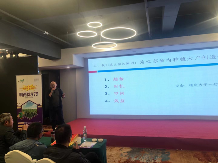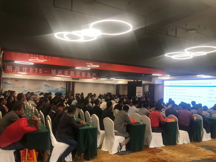 會議首先由盧偉林經理向參會代理商、種植大戶、育秧合作社代表介紹明兩優875的特征特性以及今年各縣市示范田間表現情況。盧經理介紹到隨著土地流轉,種植大戶越來越多,雜交水稻移栽成本居高不下、人工緊缺,大戶用工難、收益低。明兩優875的生育期、抗倒性、抗病性及產量結構就特別適合當下種植大戶和育秧合作社做雜交稻麥后機插種植。因此雜交水稻的麥后機插勢不可擋,明兩優875應勢而出,適時填補了江蘇淮北雜交水稻麥后機插合法品種的空白。同時詳細介紹了明兩優875的栽培管理措施。